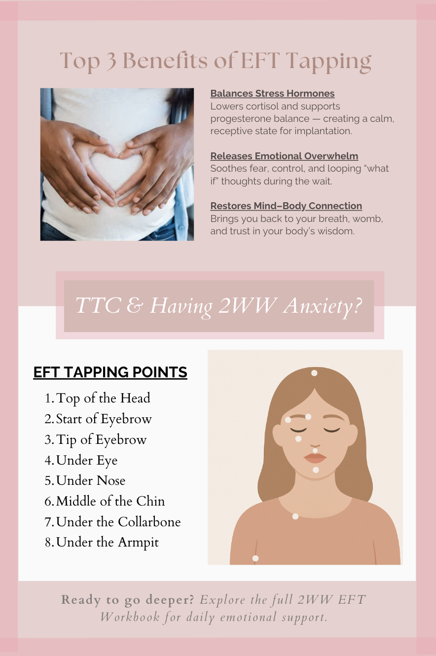 If you’d like a place to track these changes daily during your Two Week Wait, my 2WW EFT Companion Workbook includes 14 days of guided prompts, space for before/after check-ins, and journaling pages to help you deepen your practice.